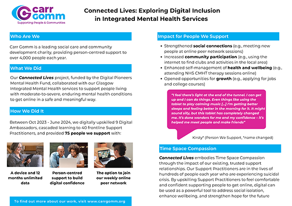 Carr Gomm's Connected Lives project, funded by the Digital Pioneers Mental Health Fund, worked with Carr Gomm's integrated mental health services in the North East, North West, and South of Glasgow to support people living with moderate-to-severe, enduring mental health conditions to get online in a safe and meaningful way.
